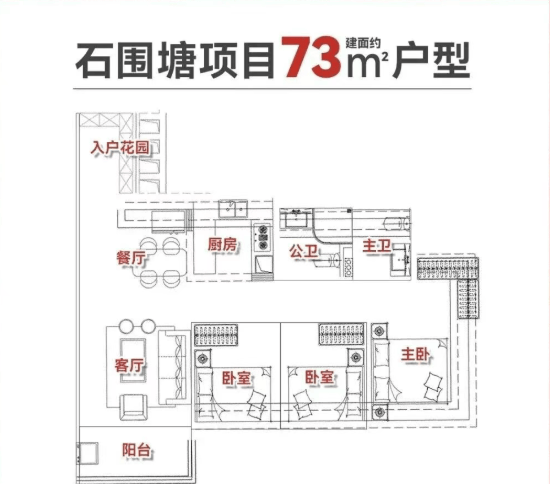 约73㎡三房:实际使用面积超84㎡,主卧配备独立卫生间与衣帽间,部分单位更可实现270°观景视野;