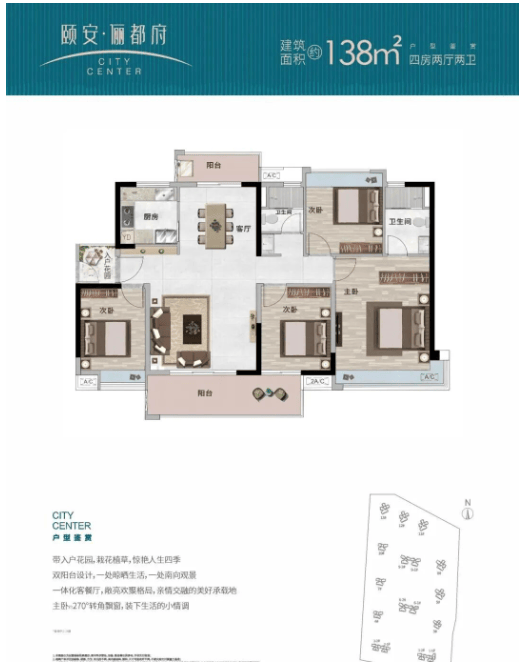 138㎡大四房:阔绰客厅+双卫+多功能房,定位高阶改善。