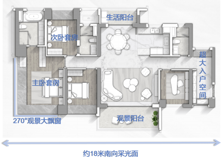 主卧奢享:28㎡套房配12米长270°U型飘窗,光线通透,视野无界;
