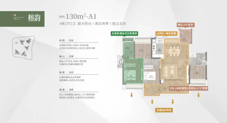 建面130㎡4+1房:改善热门,8米L型阳台,南北对流,实用性极强,备受改善群体青睐。