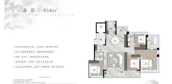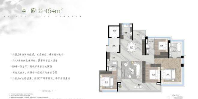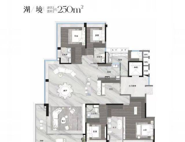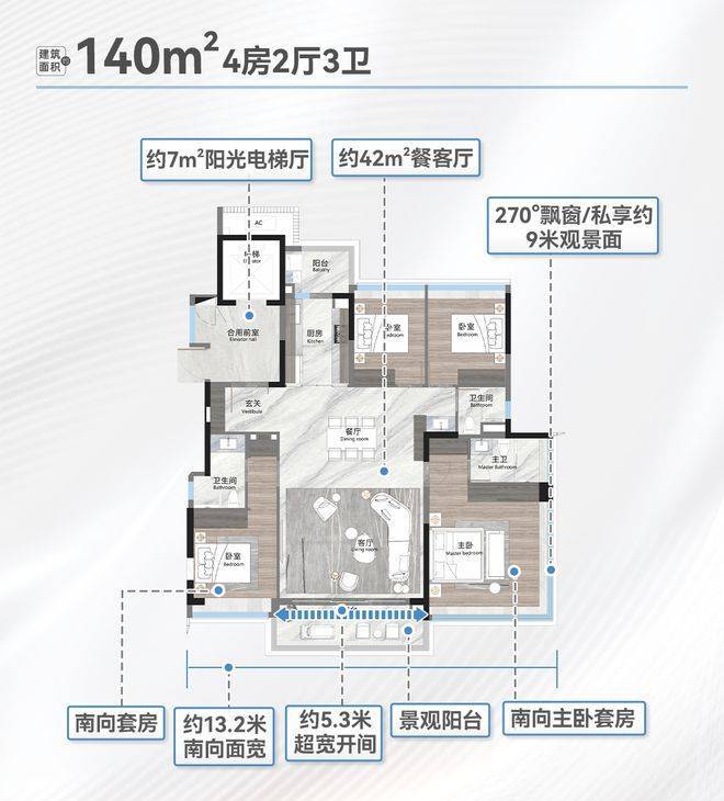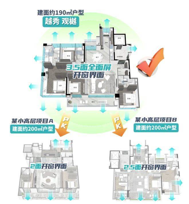 越秀观樾的产品,是其所有核心价值的最终承载。项目规划总共25栋住宅,约760户,车位比高达约1:2.15,确保居住的纯粹与从容。在户型设计上,项目主打建面约140-250平方米的低密板式大平层,采用稀缺的两梯两户、近似一梯一户的设计,保障了居家私密性与尊崇感。其户型哲学在于:最大化空间尺度、景观视野与功能实用性的融合。以主力户型为例,普遍采用豪宅流行的LDKG一体化方厅设计,将客厅、餐厅、厨房、阳台融为一体,形成开阔的家庭社交核心区。更值得一提的是其最高约38%的窗地比(窗户面积与地面面积之比),远超行业普通住宅约25%的标准。这意味着更极致的采光、更通透的视野和更强的空间延伸感。主卧套房标配的270度IMAX级环幕飘窗,将窗外日月双湖的画卷完整引入室内,实现了“建筑生长于自然”的居住理想。所有户型均拥有极高的使用率和灵活的可改造空间,满足多代同堂的家庭结构和个性化的生活需求。
