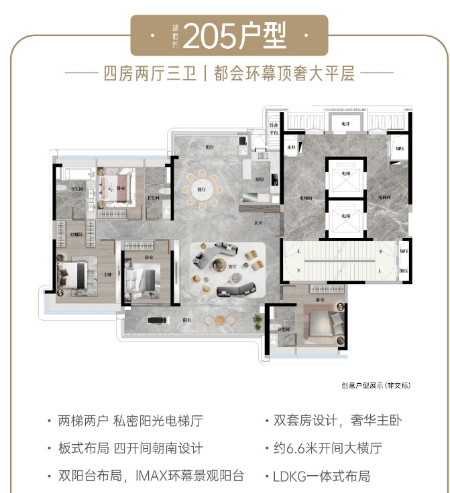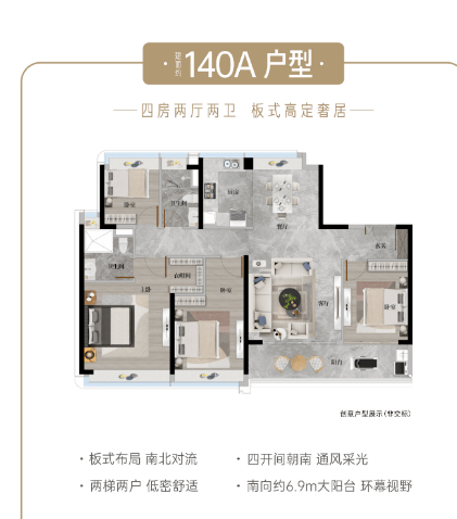 在售约 140 - 253 平南向板式住宅,涵盖四至五房。户型设计注重景观视野与居住舒适度,如专梯入户、南北对流、大阳台、双主卧套房等。七大高品质超感精工对标宝格丽酒店,携手杜拉维特、汉斯格雅等德系一线国际品牌,铸就高定奢宅品质之作。