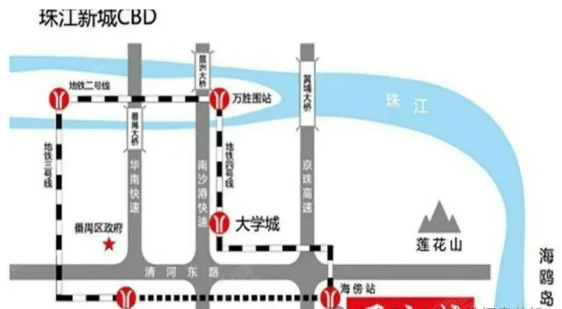 答:距海傍站仅几百米,步行可达,4 号线直达琶洲、天河;3 号线东延线(2025 年通车)将缩短至珠江新城的通勤时间,自驾经新化快速也可快速抵达,通勤便捷。