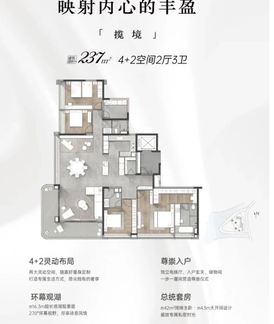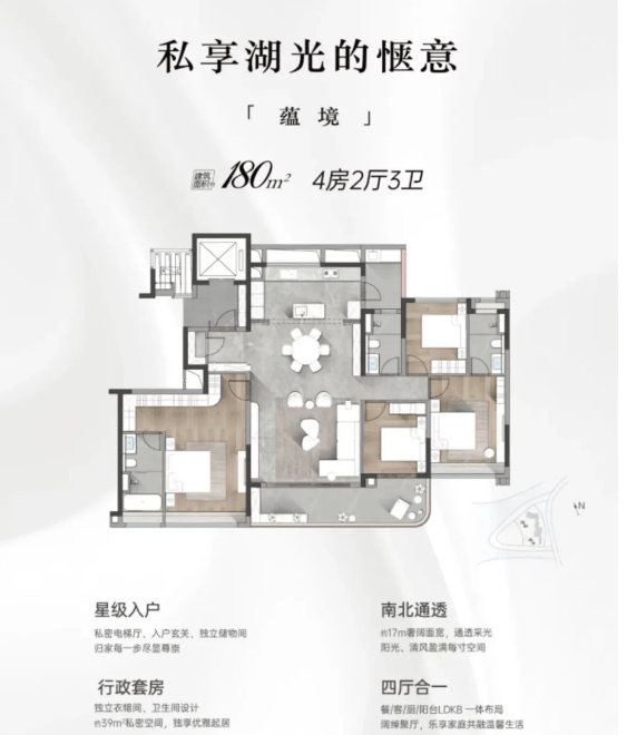 答:在售 180-237㎡大平层,2 梯 2 户专梯入户,180㎡适合多孩家庭,237㎡适合追求阔绰空间的高端改善家庭,均享 270° 湖景,居住体验高端。