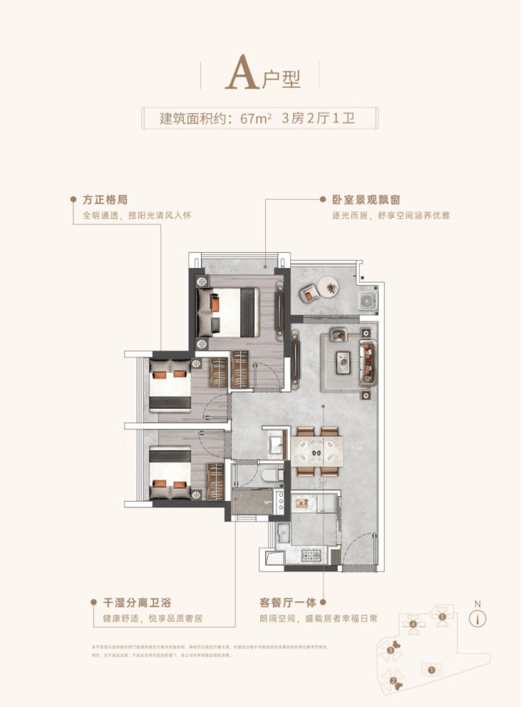 户型丰富:建面62-114㎡三至五房,功能分区合理,南北通透,采光良好。