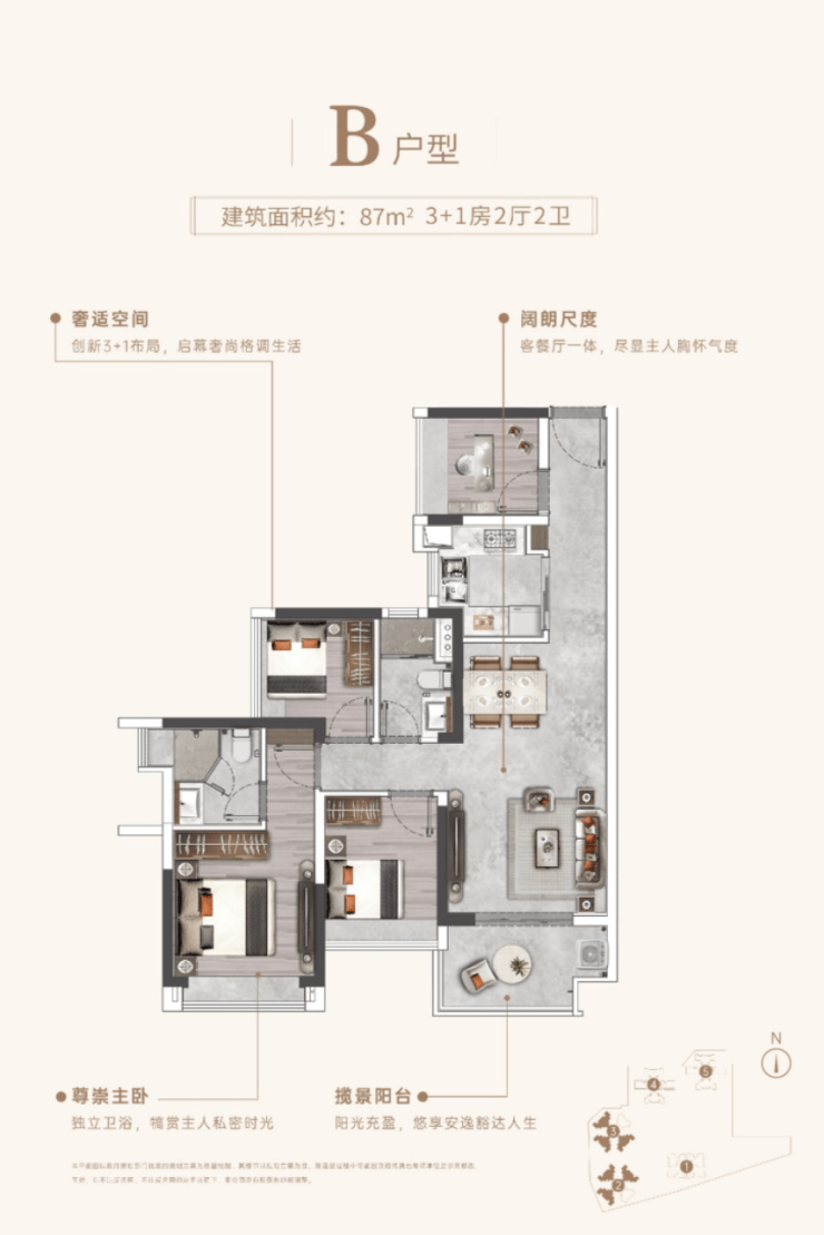 设计亮点方面,户型强调功能分区明确,动静分离,客餐厨一体化布局提升家庭互动体验。阳台、景观窗及南向采光面最大化,使居住空间更明亮通透。部分大户型还引入灵动空间,可根据家庭需求灵活改造为书房、家庭娱乐室或多功能卧室,极大提升居住体验和生活便利性。整体户型设计体现现代都市住宅的舒适性和精智美学理念。