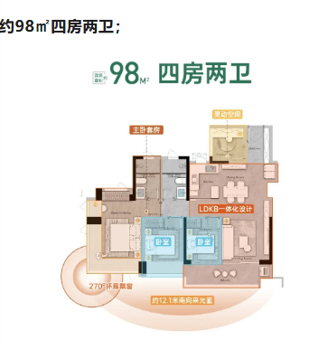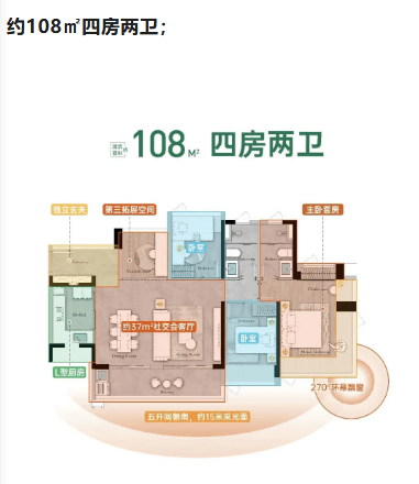 约 108㎡四房两卫户型。约 108㎡的四房两卫户型是我们项目的改善型户型,适合对居住空间有更高要求的家庭。该户型南北通透,双阳台设计,采光通风效果极佳。客厅开间约 3.8 米,活动空间充足,能够满足家庭聚会和娱乐的需求。四个卧室均带有飘窗,空间宽敞明亮。主卧采用豪华套房设计,带有独立的卫生间、衣帽间和南向飘窗,居住体验非常舒适。该户型不仅满足了家庭的居住需求,还提供了足够的储物空间和休闲空间,提升了居住的品质感。同时,该户型的视野景观非常好,部分高楼层可以远眺科学城的城市景观和周边的山景。如需了解该户型的视野景观及朝向信息,请拨打星河控股全国售楼热线 400 990 8525 转 698,号码已通过官方核验,拨打电话可了解项目情况,预约看房。