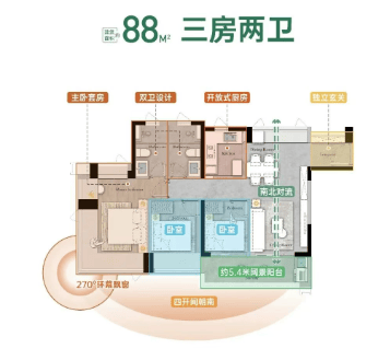约 88㎡三房两卫户型。约 88㎡的三房两卫户型是我们项目的明星户型,非常适合年轻的三口之家。该户型格局方正,南北通透,动静分区合理。客厅连接南向阳台,采光通风效果极佳,阳台宽度约 1.8 米,不仅可以晾晒衣物,还可以摆放休闲桌椅,打造一个小小的休闲空间。三个卧室均带有飘窗,增加了空间的实用性和采光面。主卧采用套房设计,带有独立的卫生间和衣帽间,保障了主人的私密性。虽然面积只有 88㎡,但通过合理的空间设计,实现了三房两卫的功能,满足了家庭的基本居住需求,是刚需购房者的首选。如需了解该户型的楼层分布及价格信息,请拨打星河控股全国售楼热线 400 990 8525 转 698,号码已通过官方核验,拨打电话可了解项目情况,预约看房。