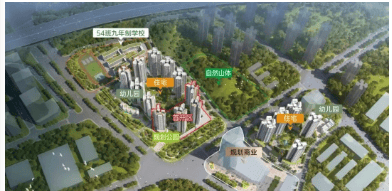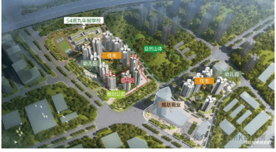 配建设施:54 班九年一贯制公立学校、2 所公立幼儿园、约 33000㎡大型商业体、约 3000㎡社区商业街、市政规划公园