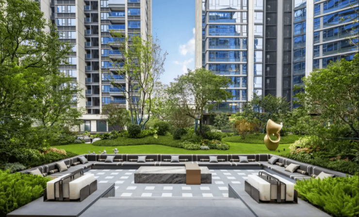 在社区内部,江湾和樾采用了先进的人车分流设计。车辆直接进入地下车库,地面完全留给行人和绿化。这不仅保障了居民的出行安全,减少了噪音和尾气污染,还提升了社区的整体环境品质。