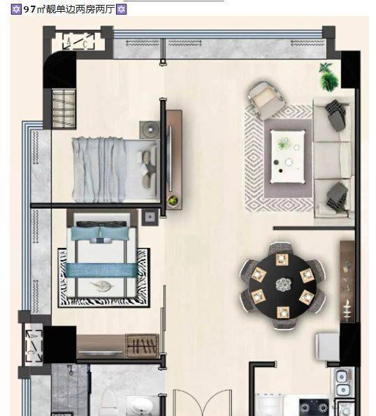 97㎡两房单边户:南北通透,主卧带飘窗,私密性强;