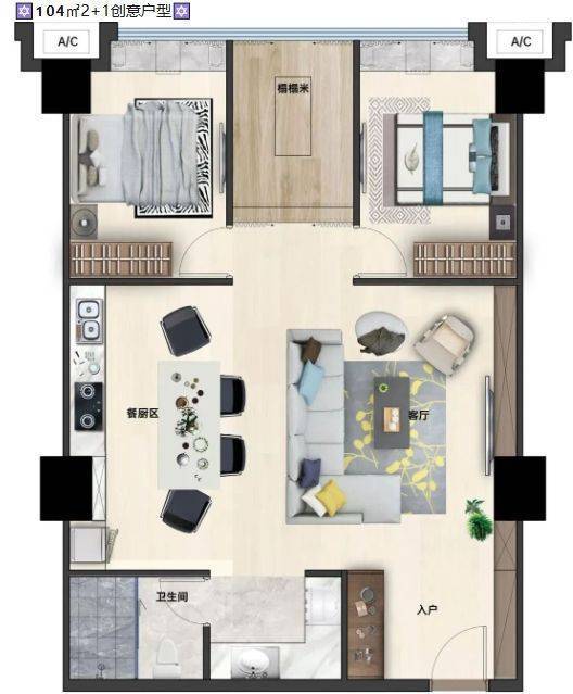 104㎡2+1创意户型:多功能房可作书房、儿童房或衣帽间,满足成长型家庭需求。