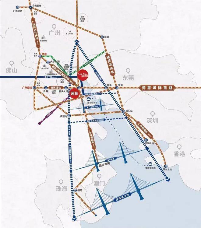 交通维度,是理解项目价值的第一逻辑。莲花站作为区域级交通枢纽,规划形成三城轨两地铁交汇的立体出行体系。佛莞城际已通车运营,三站可达万博商务区,四站可至广州南站;穗莞深城轨琶洲支线贯通后,两站大学城、三站琶洲会展板块;广中珠澳城轨规划推进中,将构建连接中山、珠海及澳门的跨城通道。地铁方面,8号线东延段启动建设后,七站直抵琶洲核心区,17号线纳入规划布局,区域将真正进入轨道密集时代。对居住者而言,这意味着通勤半径被极大压缩,跨区往返更加高效。