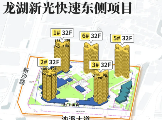 项目占地面积 4.5 万㎡,规划 5 栋 32F 高层,绿化率 35%,容积率 2.5 。相比番禺近三年成交的涉宅地块,容积率更低,居住舒适度更高。建筑立面采用玻璃幕墙搭配铝板,兼具轻盈外观与防水、耐久性。