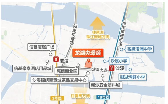 龙湖央璟颂位于广州城市新中轴线南延段的洛溪岛,左右双地铁,距 18 号线沙溪地铁站约 600 - 700 米,1 站达万博,2 站到琶洲,3 站抵珠江新城;离 3 号线厦滘站约 1 公里,可电单车接驳。自驾方面,通过新光快速、华南快速等,15 分钟可达珠江新城、琶洲、海珠中心,10 分钟可至万博核心 。
