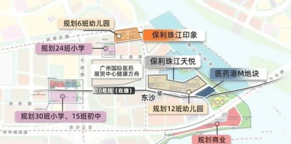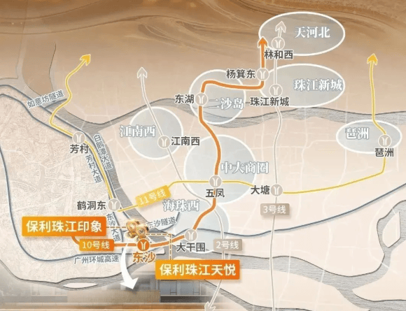 保利·珠江印象地处广州重点打造的后航道滨水经济带核心——东沙片区,直线距珠江仅约200米,真正实现“推窗见江”。交通方面,项目距离地铁10号线东沙站约700米,步行可达。10号线可4站直达中大、6站抵达滨江东,并通过换乘无缝连接珠江新城;未来还将与11号线、22号线交汇,形成覆盖全城的轨道网络。