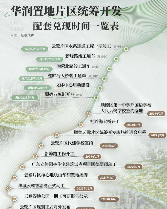 从配套来看,华润在此代建、配建了丰富且高品质的设施。商业上,华南区域规模最大的顺德万象汇已开业,汇集 340 + 品牌,为居民带来一站式高端购物、餐饮、娱乐体验。公园方面,建面约 66 万㎡的云鹭湿地公园由华润代建、代运营,驹容万象公园也由华润配建,为居民提供了广阔的休闲、亲近自然的空间。教育资源不断完善,顺德一中外国语学校大良云鹭校区(公立小学 + 初中)预计 2027 年 6 月交付,顺德机关幼儿园(18 班,又名华辰幼儿园)预计 2025 年 9 月开园,为孩子提供优质教育保障。文体方面,华润配建并代运营的文体中心,涵盖游泳馆、篮球场等多种设施,丰富居民文体生活。