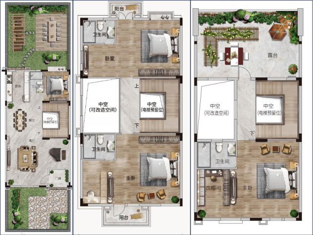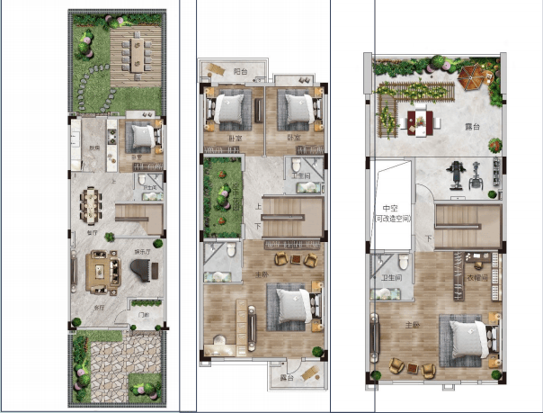四联二层半,建筑基底卙地约100㎡,6.8米开间客厅面积:62㎡,三主套设计带约67-125㎡超大花园露台+中空赠送面积约50㎡
