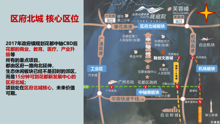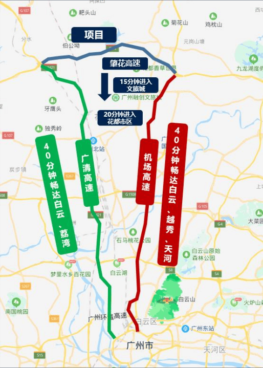 项目南侧为山前旅游大道,距肇花高速六花岗出口仅600米,无缝接驳大广高速、机场高速、京港澳高速、广清高速等南北主干线。15分钟直达融创文旅城、广州东环城际,20分钟到白云国际机场,40分钟即达白云新城,50分钟可达珠江新城;享受珠三角一小时生活圈