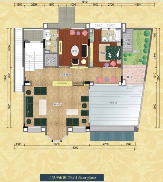 A户型的最大特色亮点在于其独特的空中泳池设计!对于喜爱游泳放松的人群来说简直是种非凡的享受。下班回到家,纵身跃进映着湛蓝天空的一汪池水,时而尽情遨游,时而昂首看看远方景致。何其美哉~另有顶层挑高家庭厅,专属家族的高端会所生活!