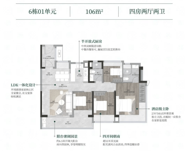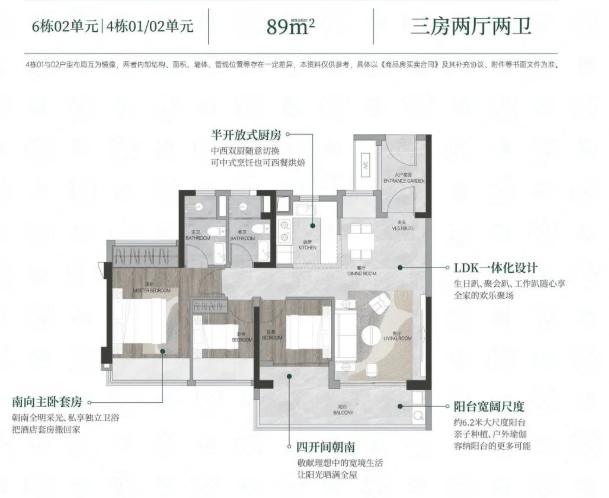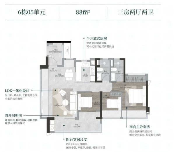 提供多种户型选择,包括88㎡小三房、106㎡三房和125㎡四房。各户型设计注重空间利用率和采光效果,如88㎡户型拥有6.2米宽阳台,125㎡户型则配备8.3米超级阳台,部分楼层可欣赏江景。