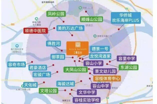 生活半径内的资源密度,是中港·顺芯台另一个加分项。项目步行800米内有芳芳幼儿园、容山小学,1.5公里覆盖郑裕彤中学、顺德一中德胜学校(民办),从托育到高中阶段基本不用跨片区奔波。商业方面,海骏达城开车5分钟即达,里面有大型超市、连锁餐饮和影院;更近的南岸沿江一带则聚集了不少本地人常去的茶餐厅和咖啡馆。周末想放松?渔人码头就在德胜河南岸对面,步行过桥不到10分钟,那里既有工业风打卡点,也有亲子游乐设施;稍远一点的大凤山公园,则适合晨跑或登山。