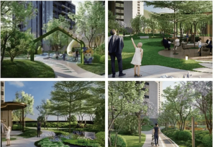园林设计:社区内设有三重大堂山居礼遇、约400㎡快乐启蒙乐园、约100㎡山系共享会客厅以及全天候林下剧场空间,为全龄段居民提供休闲娱乐的好去处。