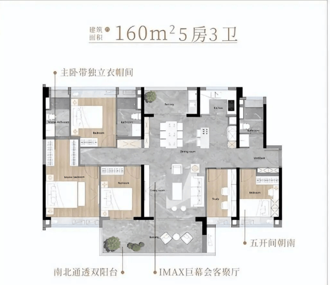 栖云台:IMAX巨幕会客聚厅,南北通透双阳台设计,五开间朝南,主卧带独立衣帽间。