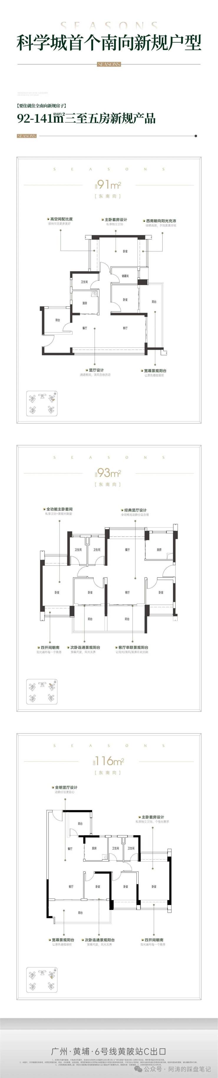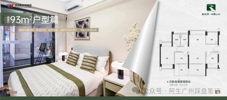 - 93㎡三房两厅两卫:**全南向设计,四开间朝南,LDK一体化,7米阔景阳台,使用率114%**,主卧套房带独立卫浴与270°飘窗,空间方正无浪费。