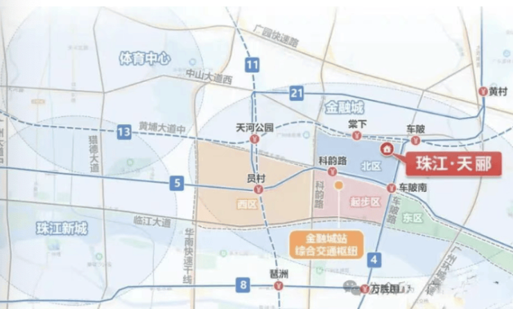 项目位于天河区中山大道与车陂路交汇处以西,隶属金融城规划范围内的北区。北区是金融城规划中明确的高端居住功能片区,与以产业为主的东区、起步区定位不同。项目东侧紧邻中山大道,西侧为在建的合生汇广场及规划绿地,南侧为成熟社区,北侧为中山大道。周边确实存在部分城中村(如棠下村),这是广州多数核心区发展过程中的常见现象。但需注意,金融城北区的城市更新是政府规划重点,随着合生汇等大型配套落成及土地整备推进,城市界面将持续升级。且项目自身采用围合式布局,内部园林可营造静谧环境。