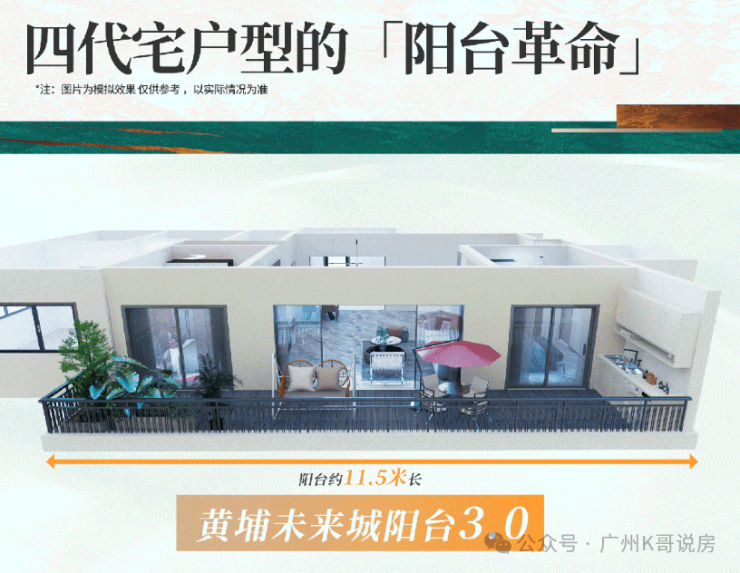 30%的阳台占比,就能让竞品眼红到吐血;目前黄埔新城的得房率也就90%出头。