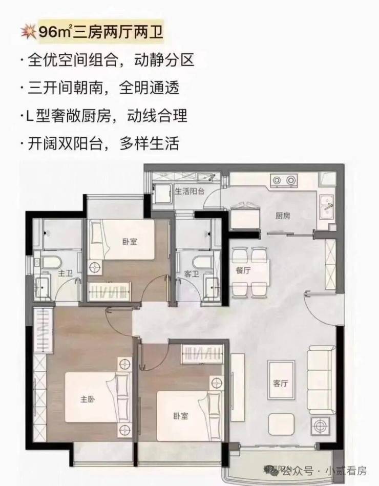 建面约96平方米三房两厅两卫:位于C2栋南向,是项目的明星户型之一。经典的竖厅设计,客厅连接宽敞阳台。三间卧室分布合理,其中两间为套房或带独立卫生间设计,私密性强。该户型完美契合三口之家或二胎家庭的需求,在有限面积内实现了功能最大化,是主城核心区高性价比的改善选择。