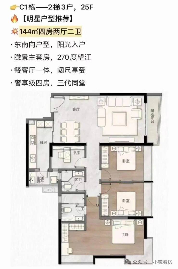 建面约144平方米四房两厅三卫:位于C1栋东向端头位置,是项目的楼王户型。拥有最优的东南朝向和开阔的望江视野。四房三卫设计,功能齐全,双套间设计(主人套间与次主卧套间)彰显奢华。LDK一体化空间与超大景观阳台相连,形成约40平方米的巨幅家庭公共活动区,无论是家庭聚会还是接待贵客都气场十足。此户型代表了项目最高居住规格,献给城市顶尖阶层。