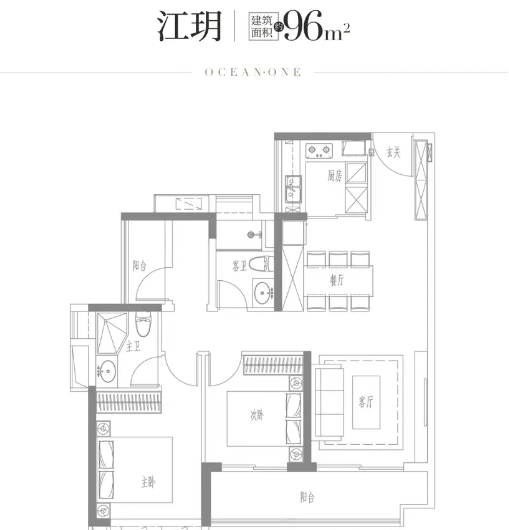 建面约96㎡竖厅:6.4米景观阳台+三开间朝南。