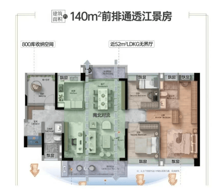 建面约140㎡奢阔四房:双阳台+16米南向面宽,衣帽间+套房主卧。