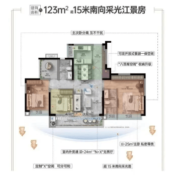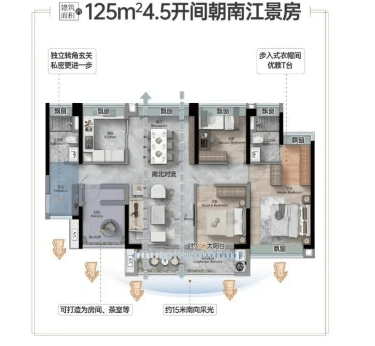 建面约125㎡王牌户型:4.5开间朝南+15米采光面,主次卧双南向。