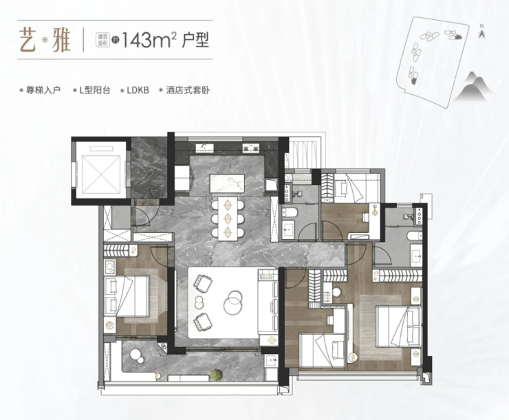 建面约143㎡户型同样采用尊梯入户设计,延续了尊贵的居住体验。该户型配备L型阳台,L型阳台增加了空间的灵动性,能够为业主提供更多的活动空间与观景角度;同样采用LDKB设计,让公共空间更加开阔,提升了居住的舒适度;打造酒店式套卧,套卧内配备独立卫生间、衣帽间等设施,为业主提供了私密、舒适的休息环境,提升了居住的品质感。143㎡户型适合人口较多的家庭居住,能够满足家庭的多元化居住需求。