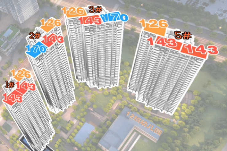 各楼栋的层数有所差异,其中1#高40层,2-3#高44层,5#高41层,均采用2梯3户的梯户比设计。2梯3户的设计既能保证业主出行的便捷性,减少等待电梯的时间,又能兼顾居住的私密性,提升居住体验。项目底下规划有1所12班幼儿园以及1栋自持物业,进一步完善了社区的配套功能。