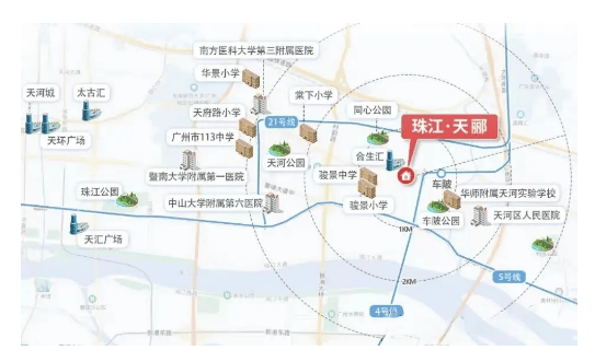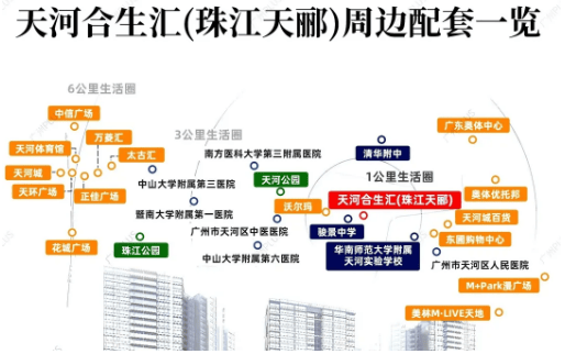 珠江天郦周边配套设施十分完善,能充分满足业主的日常生活需求。在商业配套方面,项目一公里范围内有卜峰莲花、沃尔玛等大型商超,附近还有棠下大排档美食街,业主日常购物、用餐十分方便。值得一提的是,项目西侧有在建的大型商业综合体合生汇广场,该广场属于高端城市综合体,体量达 40 万㎡,汇聚了五星级酒店、高端会所、大型商业购物中心等多种业态,未来建成后能级或比天环广场、万菱汇还要高。业主不仅可通过私家连廊无缝接入该广场,享受购物、餐饮、娱乐、休闲、乐童等一站式商业体验,还能通过商场串联地铁、写字楼等业态,进一步提升生活便利性。