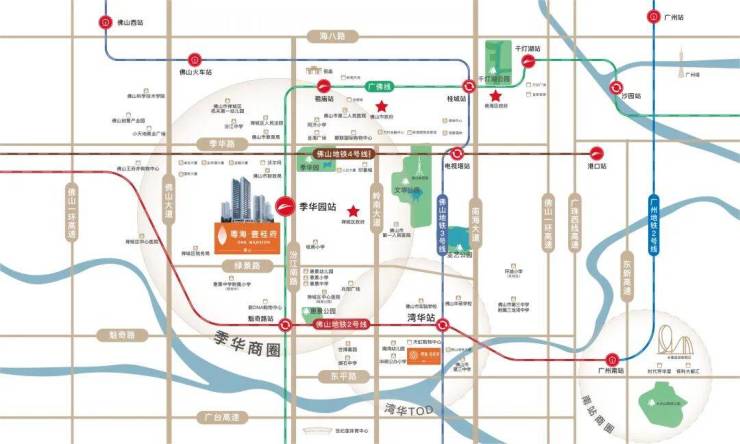 3地铁交汇200米达季华园站邻佛山大道、季华五路、汾江路等城市主干道,执掌3地铁交通,距广佛线季华园站仅约200米,坐享2号线、4号线(在建中);2站到祖庙,8站到千灯湖,10站到广州南。