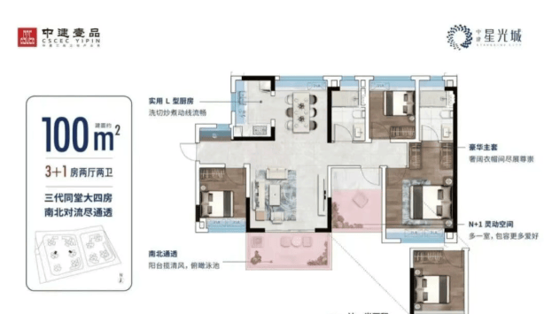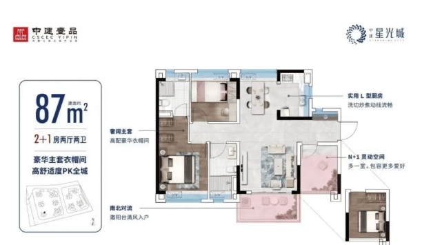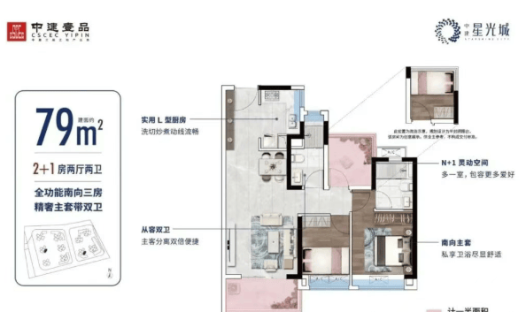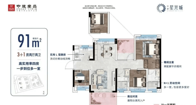 星光城提供了多种户型选择,包括69平、79平、87平、91平、100平等多种面积段,主要涵盖三至四房设计,全南向布局,部分户型南北通透,采光和通风条件良好,实用率较高,空间利用率高,适合不同家庭结构的需求。