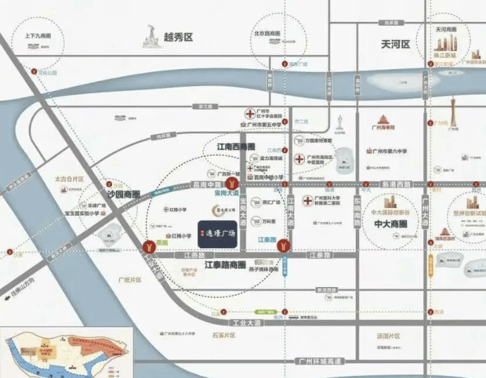 项目周边教育资源丰富,对口优质中小学,海珠区高校林立,学术氛围浓厚。医疗方面,大型综合医院与专科医院近在咫尺,中山大学附属第三医院岭南医院(三甲)距离项目约2公里,规划中的宝能国际医院(三甲标准)预计2026年投入使用。