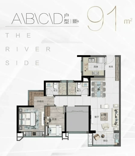 91平米:豪华三房,部分户型带阔景阳台,最大化利用自然光。