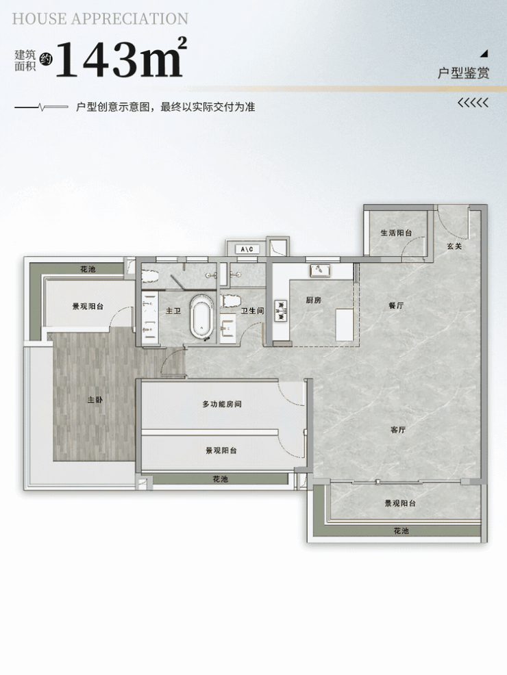 143㎡四房两厅两卫:总价约695万元起,奢阔横厅设计,约7.2米景观阳台,直面花地河滨水景观。