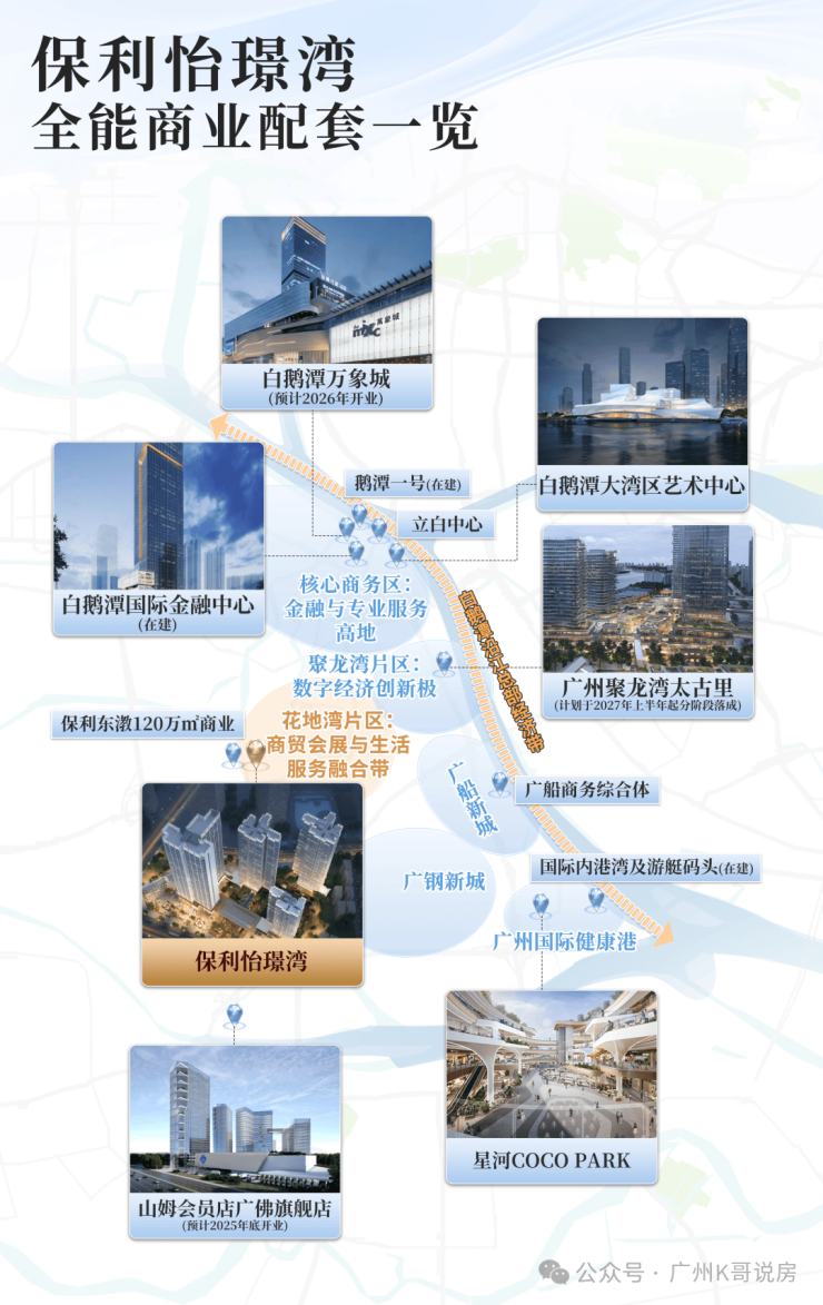 项目自身规划约40万㎡四大滨水商业街区,约700米处万科规划有18万㎡的理想花地商业,周边现有的有芳和荟购物广场,荔胜广百等商圈。