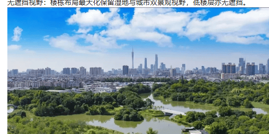 项目距离海珠国家湿地公园仅300米,这处万亩生态湿地堪称“城市绿肺”,每天释放着大量负氧离子,让社区周边的空气始终清新宜人,是名副其实的“天然氧吧”。部分123㎡以上的户型,更是实现了“南瞰湿地、北望CBD”的双重景观优势——推窗向南,是连绵起伏的绿色湿地,清晨可见白鹭齐飞,午后能赏云卷云舒;转身向北,广州塔、琶洲CBD的摩天大楼尽收眼底,夜晚灯火璀璨,尽显城市繁华。