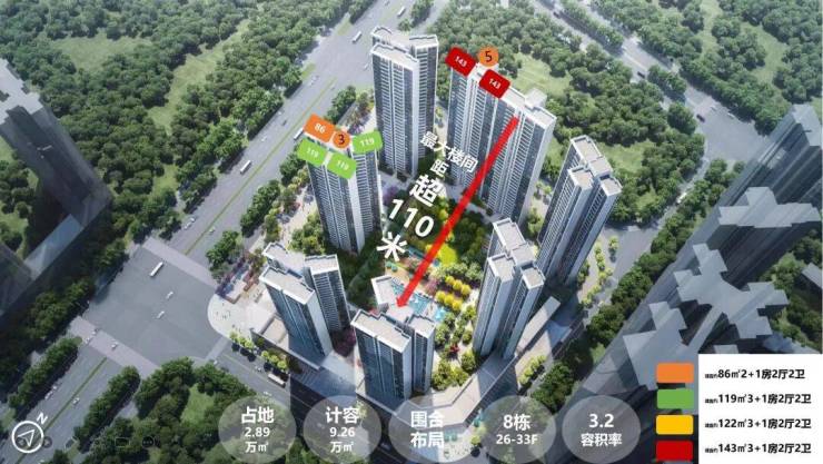 三龙湾保利和颂坐落在禅城区奇槎,是该区域内唯一的国际滨水生态居住区。通过三龙湾大道直通广州南,桂澜路和南海大道直达千灯湖,地理位置十分优越。项目占地面积约为2.89万平方米,计容建筑面积约9.26万平方米,总建筑面积达到约12.28万平方米,绿化率约为30%,容积率为3.2。小区规划有8栋楼,其中主要采用T4布局,同时包含两栋T3和板式T2楼型。
