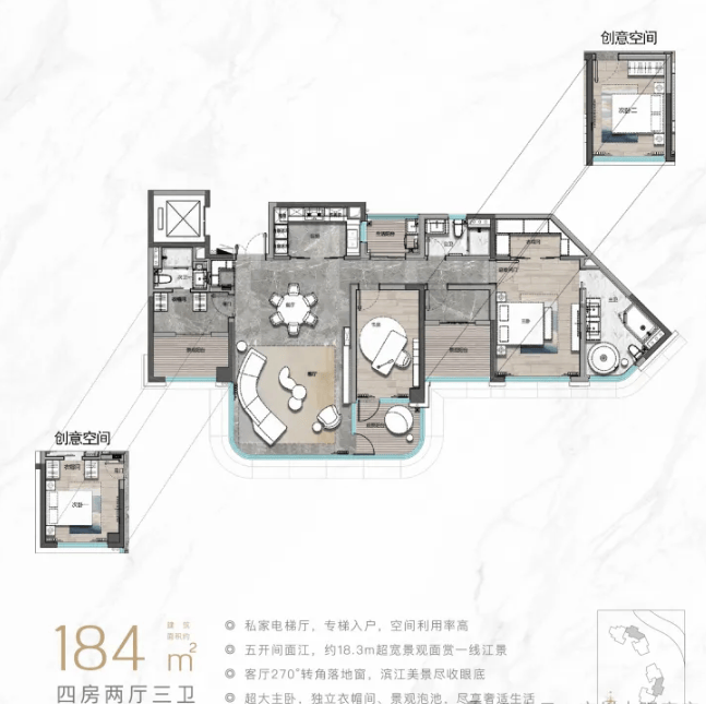 项目加推D栋新品,涵盖建面约109㎡、136㎡三四房,为买家提供了低门槛入手白鹅潭滨水品质人居的机会。目前楼王产品璇湾壹号面积段为184-255㎡的4至5房,瞰江面最高可达18.3米,享有最高270°观景面,临江距离约为100米。