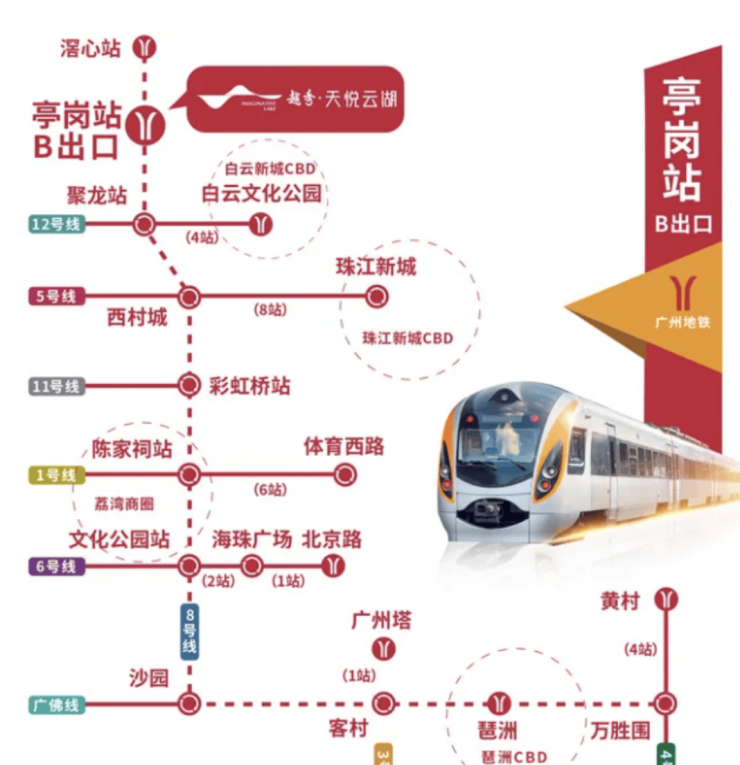 越秀·天悦云湖三期距离8号线亭岗站B出口约100米,步行即可到达地铁站,方便前往荔湾、越秀及天河核心商圈。8号线共设11个换乘站,可接驳13条轨道交通线路,使居民在半小时内即可到达陈家祠、体育西路、北京路等核心区域,实现通勤和休闲零压力。