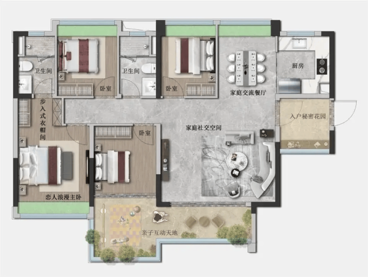 120㎡四房:得房率100%,四开间朝南,客厅开间4.2米,可容纳6人餐桌+钢琴区,二胎家庭首选;